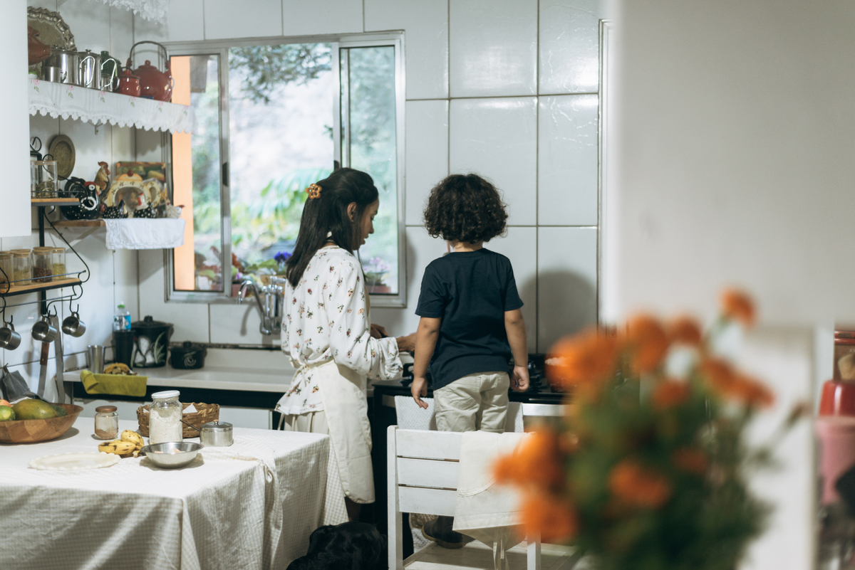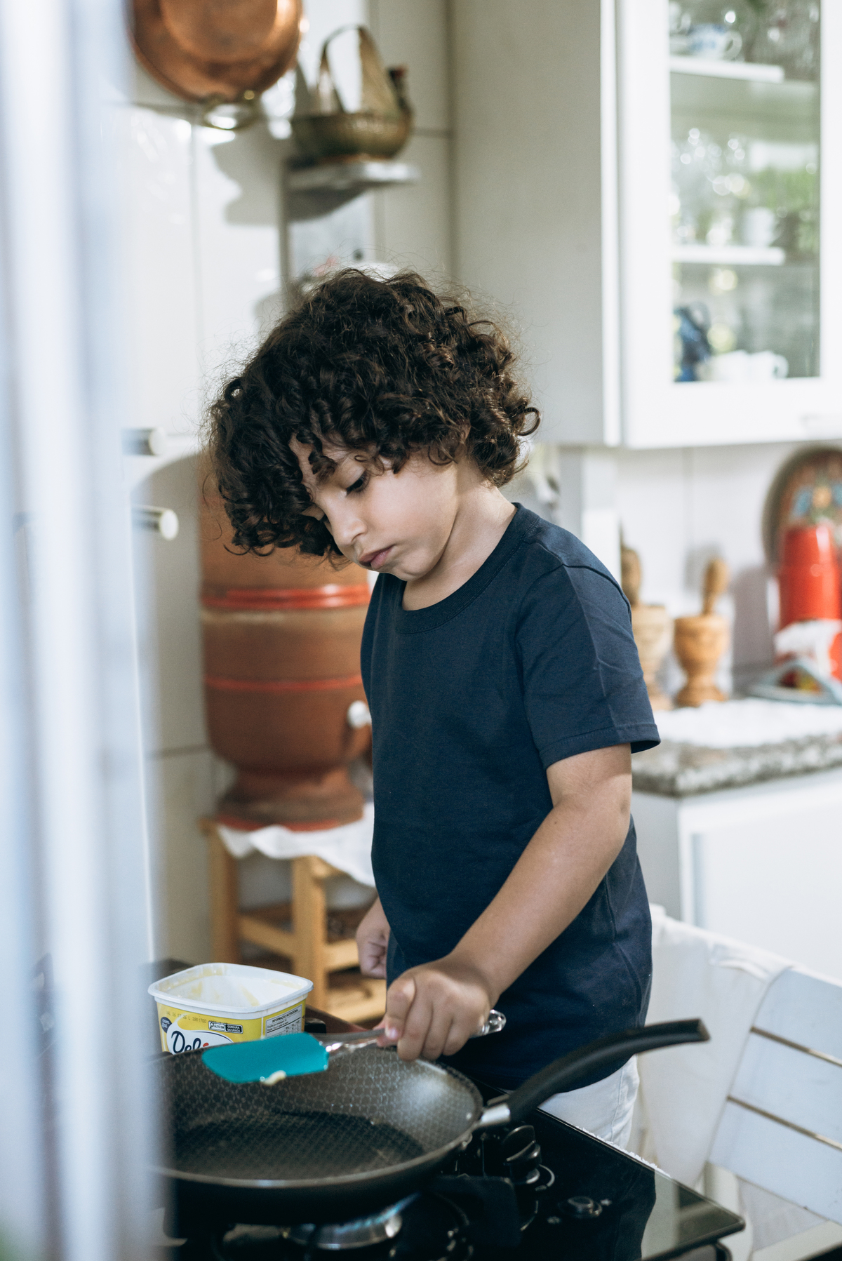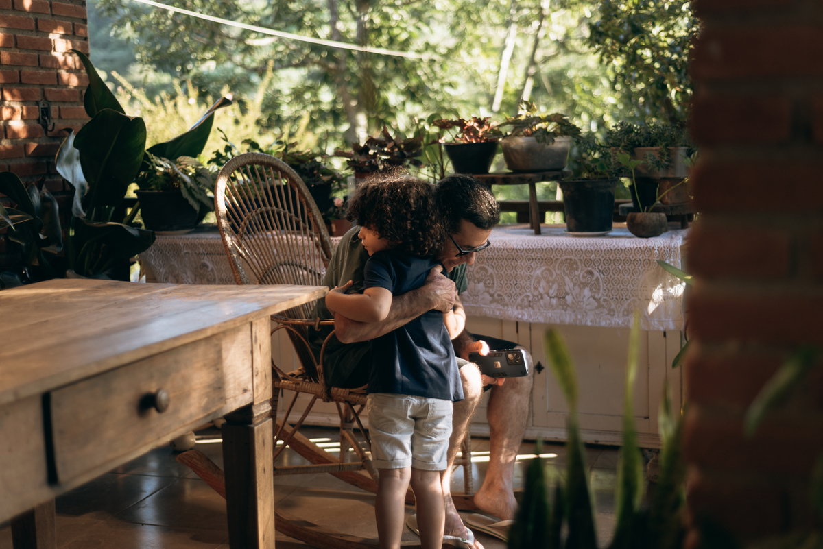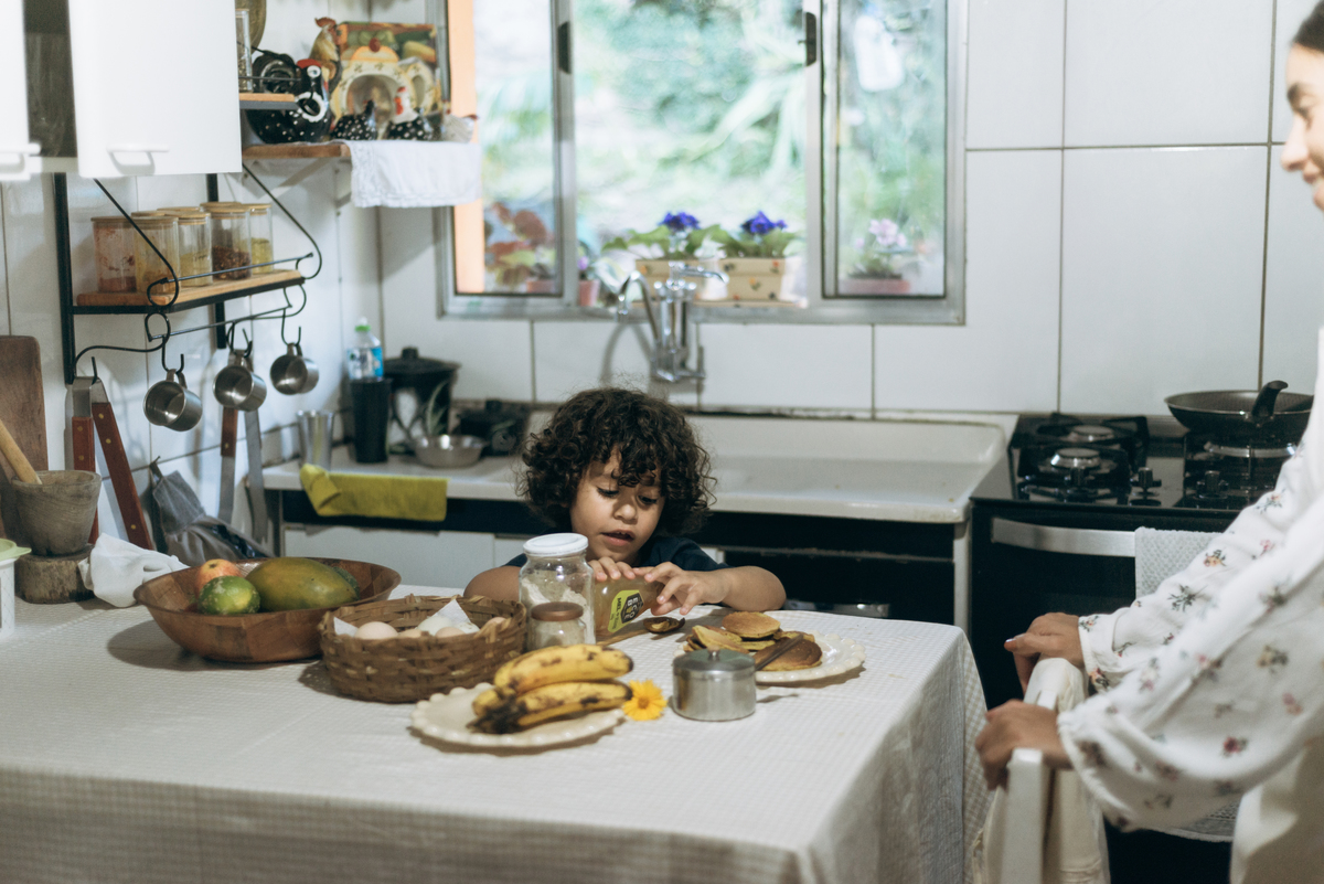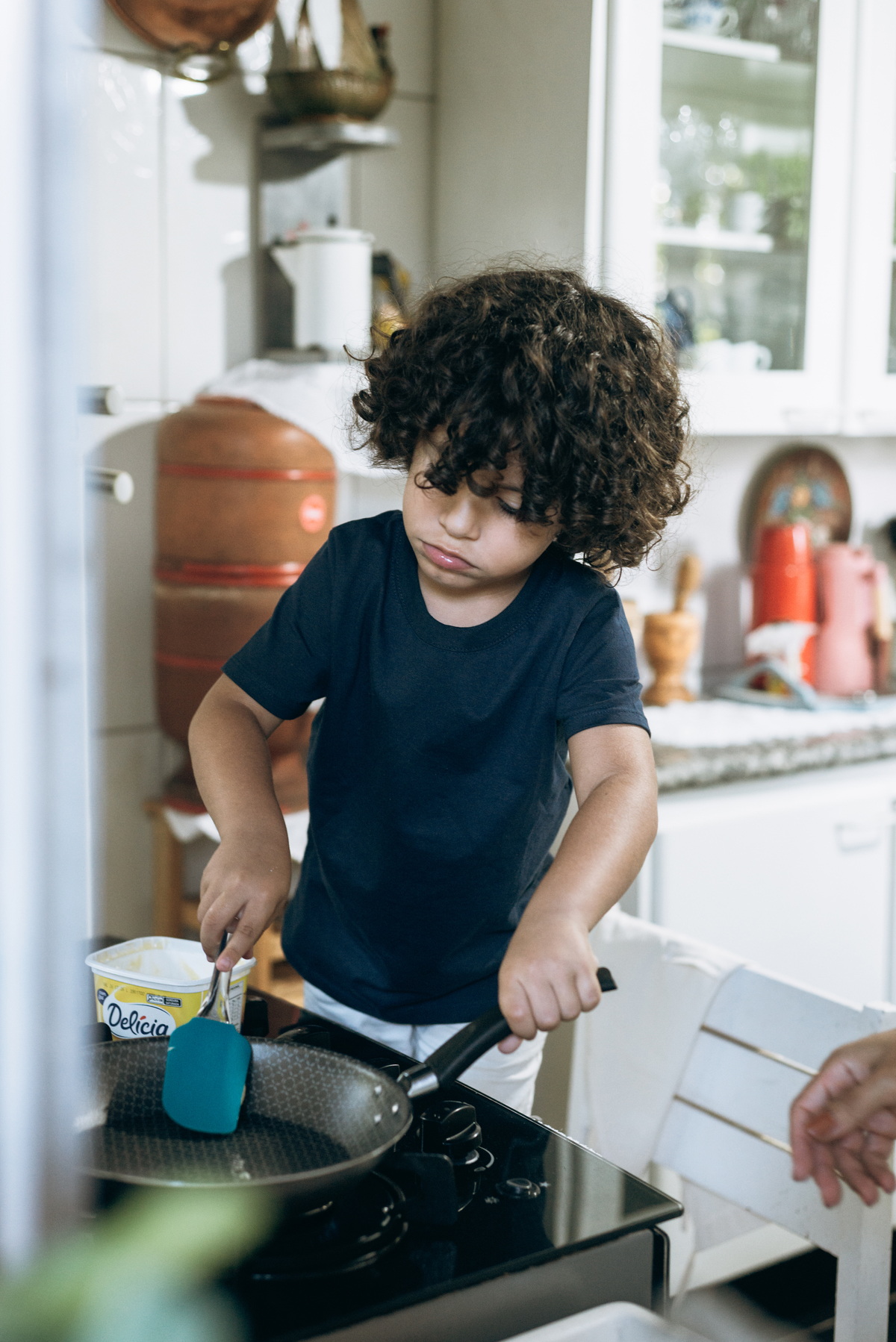 Foi especial registrar Bruna e Pedro. Sem poses, somente a vida acontecendo: a panqueca que eles fazem juntos, o jardim que eles cuidam juntos, os bichinhos que acompanham o crescimento de Pedro e tanto o ensinam sobre a vida. Teve corrida com riso solto, daqueles que não pedem licença. Teve esconde-esconde com passos leves e olhos brilhando de expectativa. Teve mãos que se procuram no meio do caminho e se encontram como quem já sabe o lugar exato de ficar. Teve abraço que é casa. Pedro, com seus quatro anos, habita esse tempo bonito onde tudo é descoberta — e Bruna, com o olhar atento de mãe, sustenta esse mundo com delicadeza e presença. Entre uma brincadeira e outra, existe um fio invisível que costura tudo: o afeto que transborda nos gestos simples. Essa sessão não é sobre fotos. É sobre memória viva. Sobre o agora que, sem fazer barulho, já começa a virar saudade.